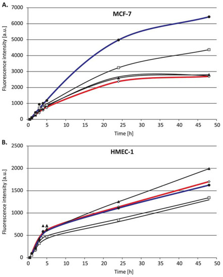 Microvascular Endothelial Cells (HMEC-1) were grown in an MCDB131 medium supplemented with l-glutamine, hydrocortisone and epidermal growth factor. Breast cancer cells (MCF-7) were grown in a MEM (Minimum Essential Media) medium, while human cervical cancer endothelial cells (HeLa) were grown in DMEM (Dulbecco's Modified Eagle Medium) medium. 10% fetal bovine serum (FBS) and streptomycin (100 mg/mL) were added to all cell culture media. The cells were grown in T-75 culture flasks at 37 °C in an atmosphere containing 5% CO2. HMEC-1 and HeLa were sub-cultured every 2 days, while MCF was sub-cultured every 3 days. The viability of cells was determined by the trypan blue exclusion assay with the use of a Countess Automated Cell Counter (Invitrogen, Carlsbad, CA, USA). Cells were seeded either in 96-well plates at a density of 1.0 × 104 cells/well in 100 μL of an appropriate medium (HeLa), or at a density of 2.0 × 104 cells/well in 100 μL of an appropriate medium (HMEC-1 and MCF-7), or in 12-well plates at a density of 1.0 × 105 cells/well and 2.0 × 105 cells/well in 1 mL of an appropriate medium, respectively. After seeding, the plates were incubated for 24 h in a humidified atmosphere containing 5.0% CO2 at 37 °C in order to allow cells to attach to the plates.