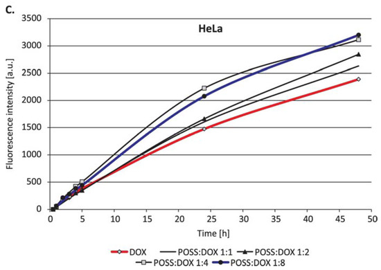In vitro uptake studies were carried out using fluorescent doxorubicin and co-delivered POSS/doxorubicin (at molar ratios of 1:1, 1:2, 1:4, and 1:8). The compounds were added at a concentration of 1 µM doxorubicin to the 12-well plates containing cells at a density of 1.0 × 105 cells/well (HeLa) or 2.0 × 104 cells/well (HMEC-1 and MCF-7). In this study, cells were incubated with the compounds for a specific period of time in a range from 5 min to 48 h in a humidified atmosphere containing 5.0% CO2 at 37 °C. After the appropriate incubation period, cells were washed with PBS, suspended in 500 µL of medium and immediately analyzed with a Becton Dickinson LSR II flow cytometer (BD Biosciences, San Jose, CA, USA) using a blue laser at 488 nm and PE (phycoerthrin) band pass filter BD, Franklin Lakes, NJ, USA at 575/26 nm.