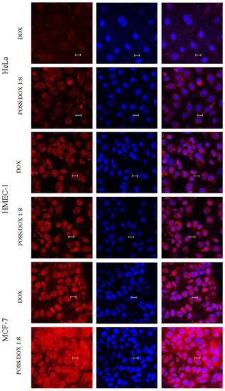 Confocal images of MCF-7, HMEC-1 and HeLa cells treated with 1 µM doxorubicin or doxorubicin (1 µM) co-delivered and polyhedral oligomeric silsesquioxane at POSS:DOX = 1:8 molar ratio. Doxorubicin (red channel), cell nucleus stained with DAPI (blue channel), and overlapping channels. Scale bars: 10 µm.