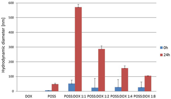 As shown in Figure 5, the diameters measured immediately after the addition of both components indicate that this addition was merely the starting point of the process of forming complexes, and the size of the complexes did not greatly depend on the POSS:DOX molar ratio. This was in agreement with the observation of no significant difference in the cell uptake of complexes at different POSS:DOX ratios when the penetration of the complexes into the cells using a flow cytometer was tested during the first 5 h. However, after 24 h incubation, the hydrodynamic diameter of the formed complexes increased considerably. The difference between the size of the complexes at various molar ratios was statistically significant. With an increase in the concentration of doxorubicin in the sample, the size of complexes decreased, thus confirming the results obtained by the MTT assay, wherein the cytotoxicity of the POSS:DOX complex at a molar ratio of 1:8 was the highest.