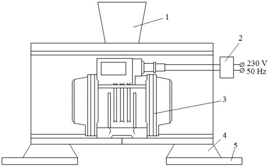 A 100 kg portion of ingots of 356 alloy was melted in an industrial electric resistance furnace and superheated up to 680 °C, and then subjected to the addition of commercial degassing compound Degasal T200 (Schaefer Chemiche Fabrik, Hennef (Sieg), Germany) to clean the melt from the oxides and hydrogen. After 10 min, the melt was poured into a cast iron permanent mold with an average diameter of 60 mm, a wall thickness of 5 mm, and a height of 150 mm. First, the mold was preheated up to 400 °C and then the melt was poured at 720 °C ± 5 °C. The pouring process was applied with various vibration frequencies, 100 Hz, 150 Hz, and 200 Hz, and with the same amplitude of 0.7 mm; the schematic illustration of the device shown in Figure 1. Additionally, the as-cast, untreated alloy was poured for comparison.