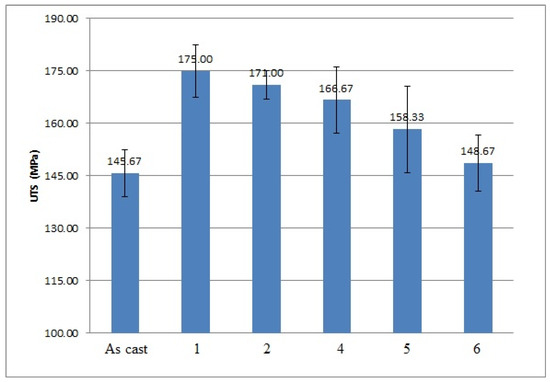 Results of ultimate tensile strength (UTS) measurements performed on 356 Al alloy: 1—after vibration by 100 Hz; 2—after vibration by 150 Hz; 4—after modification by ultrafine powder modifier; 5—after modification by ultrafine powder modifier followed by 100 Hz vibration; 6—after modification by ultrafine powder modifier followed by 150 Hz vibration; As cast—unmodified and untreated alloy.