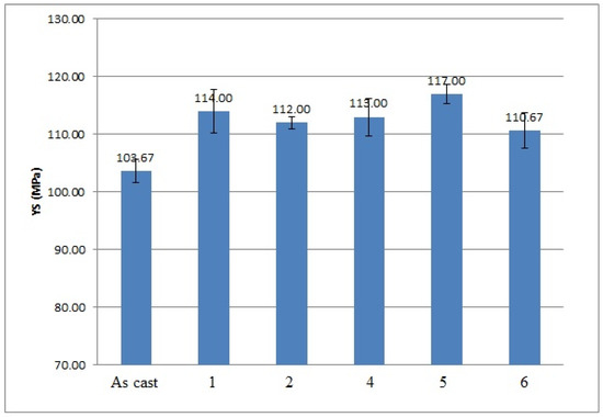 Results of yield strength (YS) measurements performed on 356 Al alloy: 1—after vibration by 100 Hz; 2—after vibration by 150 Hz; 4—after modification by ultrafine powder modifier; 5—after modification by ultrafine powder modifier followed by 100 Hz vibration; 6—after modification by ultrafine powder modifier followed by 150 Hz vibration; As cast—unmodified and untreated alloy.