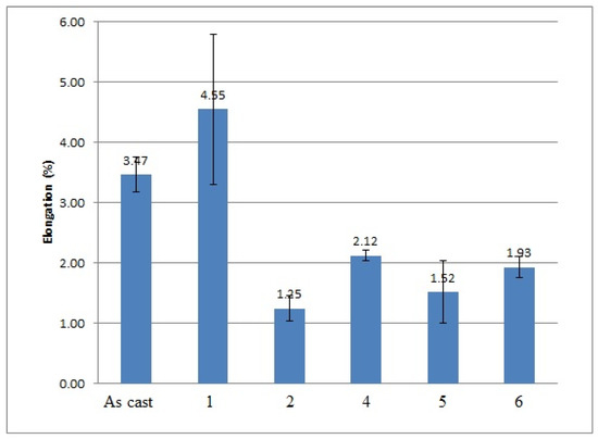 Results of elongation measurements performed on 356 Al alloy: 1—after vibration by 100 Hz; 2—after vibration by 150 Hz; 4—after modification by ultrafine powder modifier; 5—after modification by ultrafine powder modifier followed by 100 Hz vibration; 6—after modification by ultrafine powder modifier followed by 150 Hz vibration; As cast—unmodified and untreated alloy.