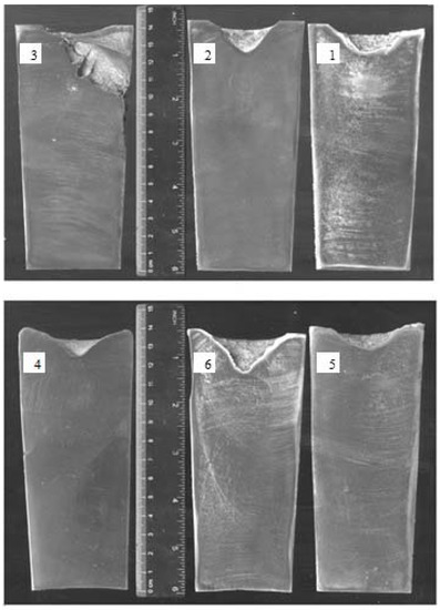 In Figure 6, it is clearly seen that the shrinkage defects with a high porosity are present in the alloy subjected to 200 Hz vibration treatment. The alloy subjected to 150 Hz vibration treatment has 18 mm deep regular-shaped shrinkage with numerous 3–10 mm long cracks on the lateral surface with no detected porosity. The alloy subjected to 100 Hz vibration treatment has the same 18 mm deep regular-shaped shrinkage but with numerous short cracks of 2–8 mm long.