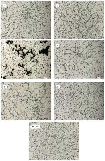 Microstructures of all treated, modified and as-cast alloys are presented in Figure 7. The specimens for microstructural studies were taken from the central area of the cast and cross-sections were prepared. Image analysis was performed based on the obtained microstructures, and the calculated length of the α-Al grains and eutectic field percentage are presented in Table 4.