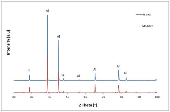 Phase analysis of the modified and unmodified alloys was identified by a Panalytical X’Pert Pro X-ray powder diffractometer (Panalytical, Almelo, The Netherlands) at 40 kV and 40 mA. The patterns were measured and recorded at the 2Θ range from 20° to 100° (step size/time per step: 0.02°/1 s).