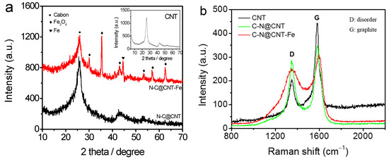 XRD patterns (a) and Raman spectra (b) of CNT, N-C@CNT, and N-C@CNT-Fe.