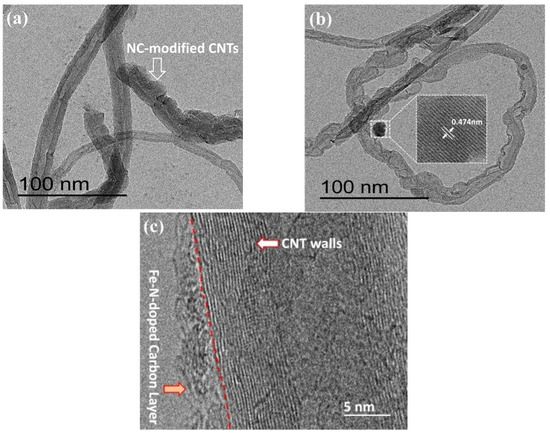 HR-TEM images of N-C@CNT (a) and N-C@CNT-Fe (b,c).