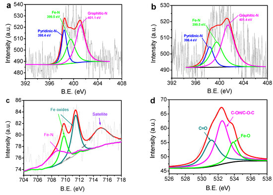 Figure 3 shows the XPS spectra of N-C@CNT and N-C@CNT-Fe. In Figure 3a, the binding energies (B.E.) of three N 1s peaks for N-C@CNT are deconvoluted at 398.4 , 399.5, and 401.1 eV, which can be identified as pyridinic-N, Fe–N, and graphitic-N, respectively [20,21]. For N-C@CNT-Fe, the N 1s XPS spectrum is also split into three peaks with B. E. values of 398.4, 399.5 and 401.4 eV, as indicated in Figure 3b. These results show that the carbon structure of as-prepared catalysts is effectively doped by nitrogen atoms, and the surface N contents are estimated to be 1.55 and 1.27 at. % in N-C@CNT and N-C@CNT-Fe, respectively. The high surface N content of N-C@CNT is further confirmed by high relative intensity and noise-signal ratio of the N 1s spectrum. We also find that high percentages of Fe–N and graphitic-N species can be obtained at two kinds of catalysts, which can be mainly responsible for the ORR electrocatalytic activity. An interesting phenonmenon is that the percentage of Fe–N species in N-C@CNT (~30.0 at. %) is almost equal to that in N-C@CNT-Fe (~30.3 at. %), but a higher percentage of graphitic-N species (~53.2 at. %) can be observed at N-C@CNT-Fe. It effectively indicates that addition of metal-Fe in the precursor has not changed the content of Fe–N species but may facilitate a higher percentage of graphitic-N species to be produced during high-temperature pyrolysis process. To confirm the presence of Fe–N bond in the N 1s XPS spectrum, Fe 2p3/2 spectrum is further analyzed in Figure 3c. Except for two iron oxides peaks (710–713 eV) and Fe satellite (714.9 eV), a distinct peak of Fe–N bond is found at 708.7 eV [22,23,24]. XPS survey (Figure S2) of N-C@CNT-Fe also shows that only metal-Fe species can be found without other metal impurities owing to the usage of pure hemoglobin as the precursor. As seen from Figure 3d, the O 1s XPS spectrum corroborates that C=O (531.4 eV), C–OH/C–O–C (532.9 eV), and metal-bounded oxygen (534.1 eV) are formed in N-C@CNT-Fe. Therefore, we consider that Fe–N and Fe–O coexist in the N-C@CNT-Fe catalyst by comprehensive analysis of Fe 2p, N 1s, and O 1s spectra.