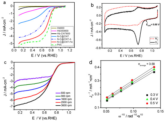 (a) Linear sweep voltammetry curves of Hb800, Hb350800, Hb-CNT800, N-C@CNT, N-C@CNT-Fe, N-C@CNT-A, and 20 wt.% Pt/C in O2-saturated 0.1 mol·L−1 HClO4 solution at a rotation rate of 1600 rpm; (b) Cyclic voltammetry curve for oxygen reduction reaction (ORR) of N-C@CNT-Fe in O2 or N2-saturated 0.1 mol·L−1 HClO4 solution; (c) LSV curve for ORR of N-C@CNT-Fe in 0.1 mol·L−1 HClO4 solution at different rotation rates (500–3600 rpm); (d) Koutecky–Levich plots of J−1 vs. ω−1/2; Data were obtained from (c).