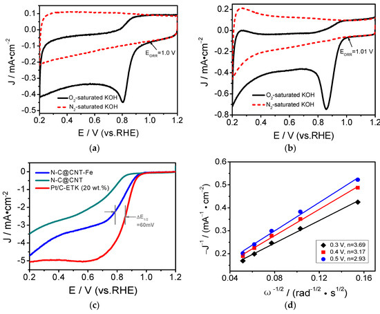 Figure 5. Cyclic voltammetry curves of N-C@CNT (a) and N-C@CNT-Fe; (b) in O2 or N2-saturated 0.1 mol·L−1 KOH solution; (c) LSV curves of N-C@CNT, N-C@CNT-Fe and 20% Pt/C in O2-saturated 0.1 mol·L−1 KOH solution at a rotation rate of 1600 rpm; (d) Koutecky–Levich plots of J−1 vs. ω−1/2; Data were obtained from (c).