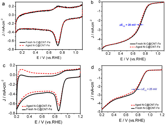 Cyclic voltammetry curves of N-C@CNT-Fe before and after accelerated aging tests (AAT) in O2-saturated 0.1 mol·L−1 HClO4 (a) and 0.1 mol·L−1 KOH solution (c). LSV curves of N-C@CNT-Fe before and after AAT in O2-saturated 0.1 mol·L−1 HClO4 (b) and 0.1 mol·L−1 KOH solution (d) at a rotation rate of 1600 rpm.