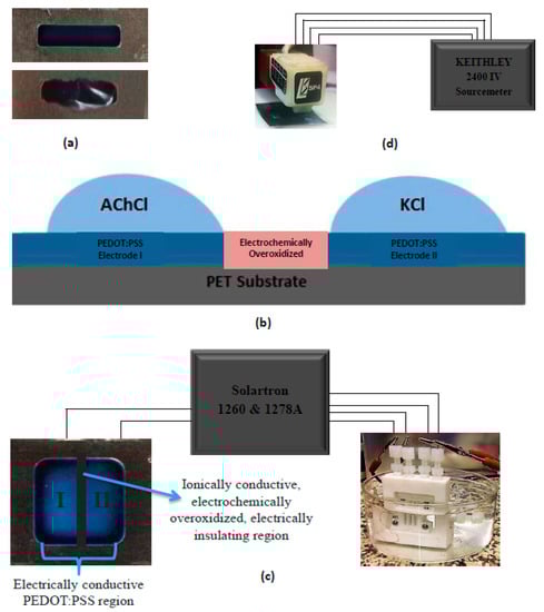 Recent advancements in the electrochemical applications of conjugated polymers have increased the demand for their utilization in several progressive fields such as biosensors [1,2], actuators [3,4], transistors, and flexible electronics [5]. A special interest was addressed to poly(3,4-ethylenedioxythiophene) polystyrene sulfonate (PEDOT:PSS), a transparent, conductive polymer, which is suitable for utilization in flexible electronic devices for their high ductility and fair conductivity. With the development of organic electronic devices for the last few years, several methods have been proposed in order to properly incorporate PEDOT:PSS into these systems. The main reason of PEDOT:PSS drawing so much attention is because it combines both ionic and electrical conductivity where the PEDOT part provides the electrical conductivity of the conjugated polymer, while the PSS offers ionic transport. Several studies in the area of organic electronic devices have been conducted [2,6,7]. Some of them are mainly based on the construction of the organic electronic ion pump (OEIP), a four-electrode delivery system designed to transfer ions from one subsystem to another via electrophoretic motion, thus mimicking the synaptic transfer in neural cells [6,7,8]. The system consists of selectively-deposited PEDOT:PSS electrodes on poly(ethylene terephthalate) (PET) substrates with a tiny overoxidized region which serves as an electrically insulating, but ionically conductive, part. The study is focused on translation of electronic signals into ion fluxes and obtaining an intracellular communication, thus mimicking the work of a neural cell. In similar studies PEDOT:PSS on flexible substrates are utilized with several methods. Processes like screen-printing, resist mask printing, UV lithography, and photolithography have been among the methods developed for PEDOT:PSS deposition on several substrates [5,9,10,11]. However, even in these highly-advanced methods several drawbacks, such as tuning the photoresist thickness, time of exposition and development, and reproducibility, constantly occur. In some cases multiple steps of patterning processes hinder the larges-scale production of these devices.