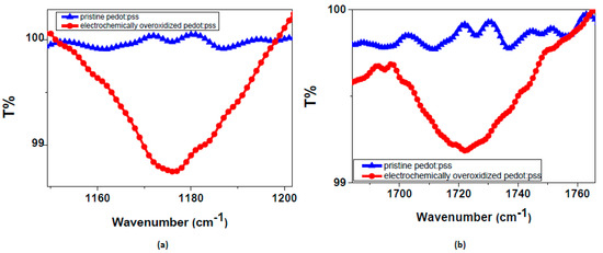 FTIR spectra of pure and overoxidized PEDOT:PSS. The most significant peak shifts in (a) represents S=O stretching at 1175 cm−1 and (b) C=O stretching at 1720 cm−1.