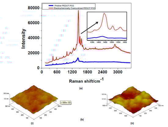 (a) Raman spectra for pristine and overoxidized PEDOT:PSS. Peaks at 1430 cm−1 correspond to the characteristic C=C stretching of the thiophene ring, which shifts and intensifies after the overoxidation step; (b) AFM images of (i) pristine and (ii) electrochemically-overoxidized PEDOT:PSS. A severe increase in surface roughness is clearly seen.
