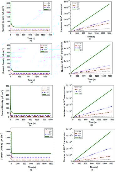 After constructing the OEIP properly, electrolyte solutions (AChCl and CaCl2 both 0.1 M) were dropped on pre-determined opposing regions. Under the effect of constant voltage, K+ ions from one electrode pass through overoxidized region to the opposite electrode. As sourcemeter Solartron 1260 and 1278 A was used to apply a constant voltage. In order to test the performance of OEIP at different conditions, side I and II were filled with AChCl (0.1 M) and KCl (0.1 M) solutions, respectively, and several potentials, such as 1, 2, 5, and 10 V, were applied for electrodes I and II and current vs. time graphs were analyzed. The number of charge values was calculated from the current versus time graphs. This was performed by a well-known “Cumulative trapezoidal numerical integration” (Cumtrapz) function in MATLAB 2013 computer aided software (R2013b version 8.2, MathWorks®, Natick, MA, USA). Then, by using Equation (1), the number of transported ions was calculated: