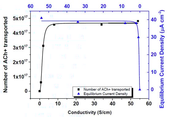 Influence of electrical conductivity of electrodes on the equilibrium current density and number of acetylcholine ions transported.