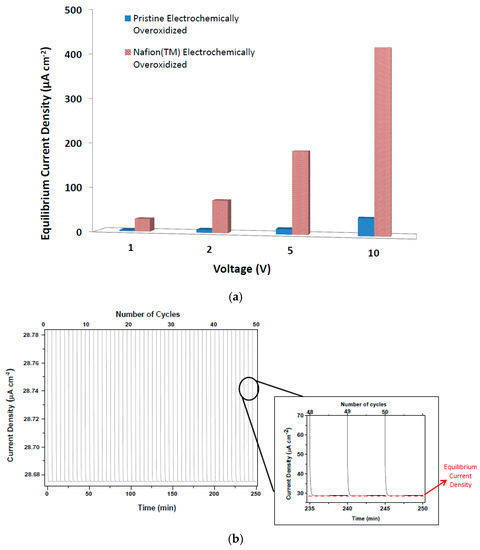 (a) Equilibrium current density values for OEIP with pristine and Nafion™-treated overoxidized regions; and (b) cyclic tests for Nafion™-treated PEDOT:PSS over 50 cycles.