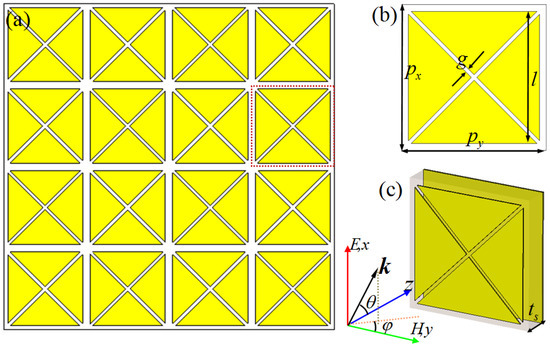We introduce a simple and compact unit cell for a six-band PMMA, as shown in Figure 1. The designed PMMA is composed of a metallic CCPR array over a ground plane layer separated by a dielectric substrate. Figure 1a shows a 2D array structure of the designed PMMA, and the front view and perspective view of the unit–cell structure are displayed in Figure 1b,c. The optimized geometrical parameters of the unit–cell of the PMMA are as follows: px = py = 75 μm, l = 68 μm, g = 1 μm, ts = 3.8 μm. The unit–cell structure of the PMMA is periodic along the x and y axes, with periods of 75 μm to avoid diffraction at the normal incidence for frequencies up to 4 THz. In our interesting frequency range (0.8–3.2 THz), the metal elements (CCPR structure and ground plane layer) are made of a lossy copper film with a frequency-independent conductivity σ = 5.8 × 107 S/m and a thickness of 0.6 μm, which is much larger than the typical skin depth in the terahertz regime (to avoid transmission through the ground plane metallic film). GaAs with a complex dielectric constant of ε = 12.9 + 0.0774i was selected as the dielectric spacer between two metallic layers.