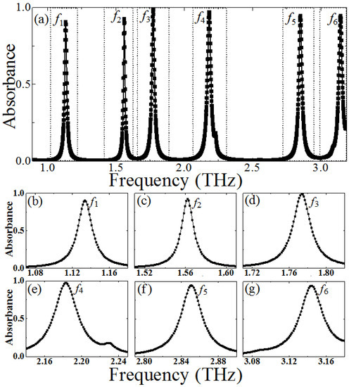 (a) The absorption spectra of the proposed six-band PMMA, (b–g) the absorbance spectra under different resonant frequency domain.