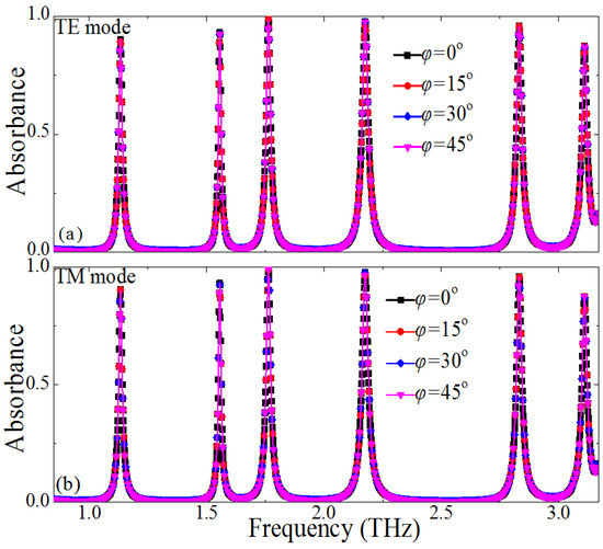 Dependence of the absorption spectra on the polarization angles of the normal incident terahertz wave for the proposed PMMA: (a) transverse electric (TE) mode and (b) transverse magnetic (TM) mode.