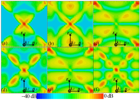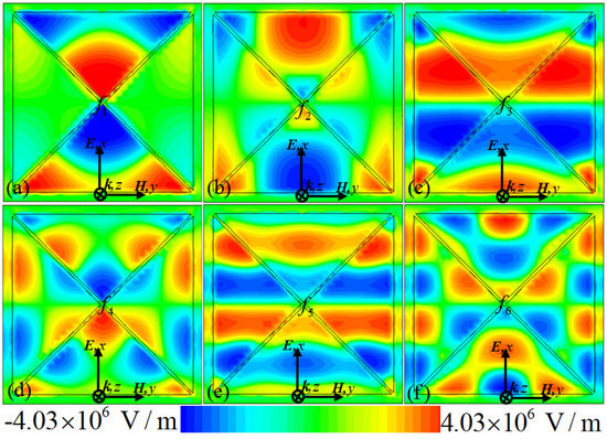 Figure 2 shows the simulated absorbance spectra of the proposed PMMA: six resonant frequencies (f1, f2… f6) can be observed clearly. From Figure 2b–g, at resonant frequencies of f1 = 1.13 THz, f2 = 1.56 THz, f3 = 1.77 THz, f4 = 2.18 THz, f5 = 2.85 THz, and f6 = 3.14 THz, the absorbance A(ω) is about 90.5%, 94.4%, 98.7%, 96.2%, 95.4%, and 95.2%, respectively. The corresponding electric thickness of the PMMA is about λ1/70, λ2/50, λ3/45, λ4/36, λ5/28, and λ6/25, respectively (the λi is the resonance wavelength, where i = 1, 2, 3…6). Thus, our designed PMMA possesses an ultrathin thickness compared with the operation wavelength (<λ/25, at 3.14 THz). In addition, it also exhibited a frequency selectivity of the six-band PMMA, since the bandwidth of perfect absorption is very narrow and the off-resonance absorption is very small (A(ω) < 5%). The peak absorption at different resonant frequencies corresponds to the nature of the different resonance modes, which will be illustrated and classified by analyzing the distributions of the electric fields of the unit–cell structure. It can be conjectured that the high-level absorption of those six resonance peaks is attributable to the higher-order multipolar plasmon resonances of the CCPR structure. It can be found that the absorption frequency band for the six-peak PMMA is relatively narrow compared with the previous PMMAs [5,6,7,8,11,12,36,37]. It is expected that the proposed PMMA has a significantly higher Q factor than the previous ones.