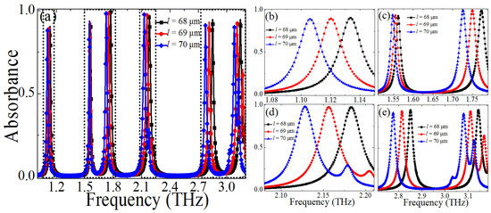 (a) Dependence of the absorption spectra of the proposed PMMA on the size changes of the cross-cave patch resonator (CCPR) length l (l = 68 μm, 69 μm, 70 μm), (b–e) dependence of the absorbance spectra on the l at different frequency domains.