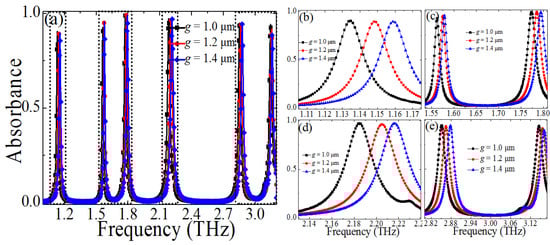(a) Dependence of the absorption spectra of the proposed PMMA on the size changes of the CCPR gap width g (g = 1 μm, 1.2 μm, 1.4 μm), (b–e) dependence of the absorbance spectra on the g at different frequency domain.