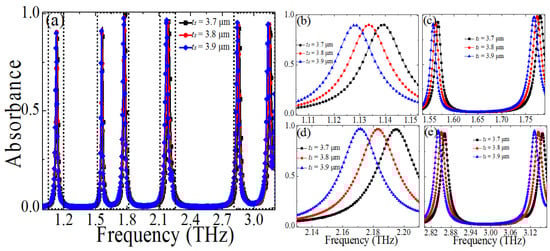 Furthermore, we discuss the effect of the dielectric layer thickness ts on the absorption, and Figure 8 shows the calculated absorbance of the PMMA with different ts (ts = 3.7 μm, 3.8 μm, 3.9 μm) while the other geometric parameters were unchanged. From Figure 8b–d, it is obvious that the resonance absorption frequencies (f1, f2, f3, and f4) drift to the lower frequency, and the absorption peak remains unchanged at a high level when changing the parameter ts from 3.7 μm to 3.9 μm. Although the absorption frequencies (f5 and f6) also shift to the higher frequency, the absorption peaks will increase with the increase of the dielectric layer thickness ts, as shown in Figure 8e. In this case, when increasing the dielectric layer thickness ts, the L will increase, thus the multiple resonant frequencies will decrease accordingly.