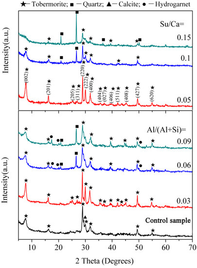 For the samples with sucrose, the higher overall peak intensity of tobermorite at Su/Ca = 0.05 indicates an increased reaction rate to tobermorite. At a sucrose concentration of Su/Ca = 0.1 the weaker overall peak intensity of tobermorite alongside additional quartz peaks demonstrate a lower reaction degree. As the sucrose concentration further increases, the diffraction peaks corresponding to tobermorite become broad and ambiguous at Su/Ca = 0.15 suggesting a low crystallinity. This phenomenon may be explained that the concentration of Ca2+ is increased by sucrose [24]. As Al-Wakeel [25] pointed out, the concentration of Ca2+ has a great impact on the nucleation and growth of C-S-H. At a high level of sucrose concentration, the availability of Ca2+ is probably reduced due to excessively complexed calcium by sucrose [26], which retards the hydrothermal reaction.