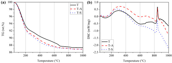 It can be observed that the total weight loss of the investigated samples is in the range of 12.7–13.2% and is in the typical range for tobermorite material. Shaw et al. [5] determined a total weight loss of 12.2% for 11 Å tobermorite, which is close to our results and verifies the XRD results. The weight loss in the temperature range of 100–400 °C for the T-A sample and T-S sample is higher than that of the control sample indicates more interlayer water. Thus, there is more Ca2+ in the interlayer, which may be favorable for the ion exchange process when tobermorite is directly used as an adsorbent.
