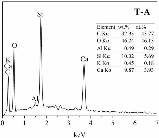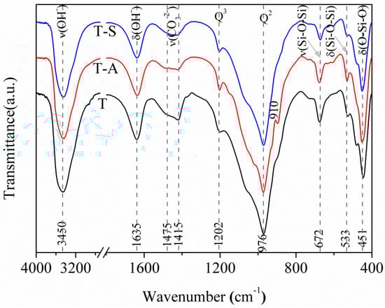 Figure 3 displays that the resulting three FT-IR spectra plots show similar behaviors concerning the wavenumber from 4000 to 400 cm−1 indicating that incorporations of aluminum and sucrose have little effect on the change of silicate chain structure. The FT-IR spectra display a main narrow bands around 976 cm−1, typical of the Si-O stretching vibrations generated by Q2 silicon sites [2,27,29]. Band at 1202 cm−1 is due to Si-O stretching vibrations in Q3 silicon sites specific for tobermorite [27]. A shoulder at 910 cm−1 for T-A sample may be assigned to O-H bending vibrations in Al-OH-Al bonds (octahedral aluminum) [2]. The band at 672 cm−1 is due to Si-O-Si stretching vibrations in SiO4 tetrahedra. It should be noted that the higher band intensity of Q3 silicon sites alongside the weaker band intensity of SiO4 tetrahedra for T-A sample and T-S sample compared to the cases for the control sample indicate an increased polymerization degree of silicate chains by incorporating aluminum and sucrose. The bands in the range of 533–451 cm−1 are assigned to O-Si-O deformation and bending modes of SiO4 tetrahedra [2,27,29]. The band at 1635 cm−1 is due to H-O-H bending vibrations and the band centered at 3450 cm−1 is associated with O-H stretching vibrations [2,25,27,29]. In the region of 1475 to 1415 cm−1, the spectra show a very broad band corresponding to asymmetric stretching of CO32−.