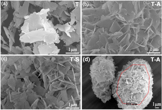 SEM images of the tobermorite samples: (a) the control sample; (b) and (d) the T-A sample; (c) the T-S sample.