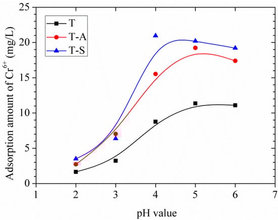 The adsorption of Cr(VI) from aqueous solutions is highly dependent on the pH of the solution because the pH affects not only the surface properties of the adsorbents but also the ionic state of chromium during the reaction. In this study, the effects of pH on the adsorption amount of the tobermorite samples are shown in Figure 8. The tendencies of adsorption amount with the increase of pH are quite similar for different tobermorite samples. The adsorption amount increases when pH increases from 2.0 to 4.0, and the maximum adsorption amount of Cr(VI) by T-S sample is found at about pH 4.0 while those of T-A and T samples are at about pH 5.0. Moreover, the adsorption amount of Cr(VI) by all samples slightly decreases as pH increases to 6.0. This result is consistent with the previous results [15,16] and can be explained as follows: different species of Cr(VI) (e.g., Cr2O72−, CrO42−, and HCrO4−) coexist at acidic condition. The predominant Cr(VI) species at pH 2.0–4.0 is the monovalent HCrO4−, which is favorable adsorbed since it has a low adsorption free energy [19]. On the other hand, when the pH value is low, adsorbent (tobermorite samples) static charges are presented in positively charged form, so the adsorption rate of Cr(VI) is relatively high by electrostatic interaction. Apart from the electrostatic interaction effect, complexation of HCrO4− with the interlayer or Ca2+ structural calcium in the structure of tobermorite may occur during the absorption process. The absorption mechanism will be interpreted in detail in Section 3.3.4. The decrease of adsorption amount at pH 6.0 may be due to: (1) more adsorption sites required for the bivalent Cr2O72−and CrO42−, which are the predominant species at pH 6.0; (2) competitions from increasing OH− ions with Cr(VI) anions for the adsorption sites; and (3) more negative charges on the surface of tobermorite [15,16]. In comparison, the adsorption amounts of Cr(VI) by T-S and T-A samples are higher than that of T sample at the same pH value. This may be because the amount of adsorption sites in tobermorite incorporating aluminum and sucrose is substantially more than those in the control sample.
