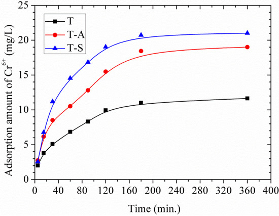 Figure 9 displays the adsorption amount of Cr(VI) by tobermorite as a function of time. All the materials show fast adsorption during the first 60 min of the reaction and a much slower subsequent removal followed by an equilibrium state within 3 h. This equilibrium time is close to those of magnetite nanoparticles (2 h) [19], natural clay (2–3 h) [14,15,16] fly ash (3 h) [17] and is much higher than that of activated carbon (24 h) [18]. It should be noted that the adsorption of Cr(VI) onto tobermorite is a combination of physical adsorption and chemical adsorption since the physical adsorption is usually a rapid adsorption process [15,16].