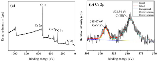 XPS spectra of the tobermorite sample after absorption: (a) survey; and (b) Cr 2p.