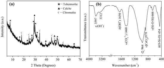 XRD pattern (a); and FT-IR spectra (b) of the tobermorite reacted with Cr(VI).