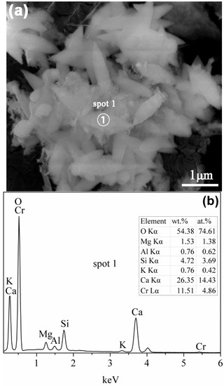 SEM image (a); and EDX spectra (b) of the tobermorite reacted with Cr(VI).
