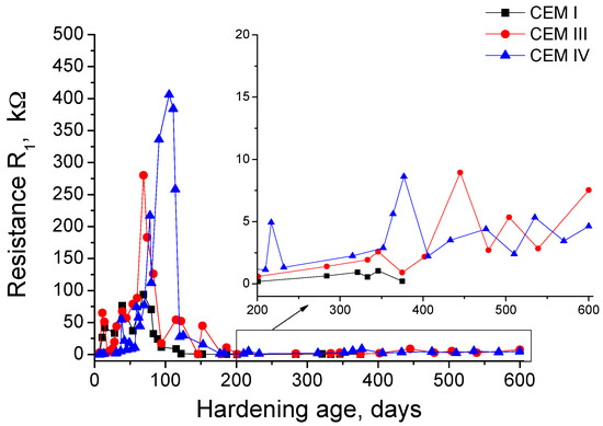 Results of impedance spectroscopy resistance R1 for CEM I, III and IV grouts.