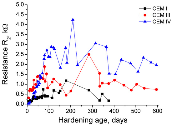On the other hand, the resistance R2 is related to all the pores of the sample [42]. In general, its results (see Figure 3) are in keeping with those obtained for resistance R1, such as the greatest R2 values observed for fly ash and slag cement grouts compared to CEM I ones, which would reveal once again the higher pore network refinement produced by these active additions. Nevertheless, there are some differences between the results of resistances R1 and R2. The maximum R2 values were reached later than the maximums resistances R1 for the three types of studied grouts. Moreover, the fall of resistance R2 at greater ages was not as pronounced as the decrease noted for resistance R1. This also happened for all the grouts, so it suggests that sulphate attack has less effect in resistance R2 than in R1.