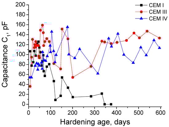 Now, the capacitance C1 results will be described, which can be observed in Figure 4. At very early ages, the lowest values of this parameter have been observed for CEM IV grouts. In general, the C1 increasing rate in the short-term was similar for CEM I and III samples, whereas it was slower for CEM IV ones. For CEM I grouts, the capacitance C1 showed a decreasing tendency from 50 days, although it has been observed little rises at 100 and 150 days. For CEM III grouts, this parameter showed the first maximum at 70 days, and from then, C1 decreased and after that it rose again, reaching another maximum at 150 days approximately, followed by an important fall at about 200 days, increasing again from then to the end of research. As has already been explained, the capacitance C1 for CEM IV grouts showed a slower rise compared to CEM III ones. However, from 120 days, the C1 values and their evolution were very similar for both fly ash and slag cement grouts.