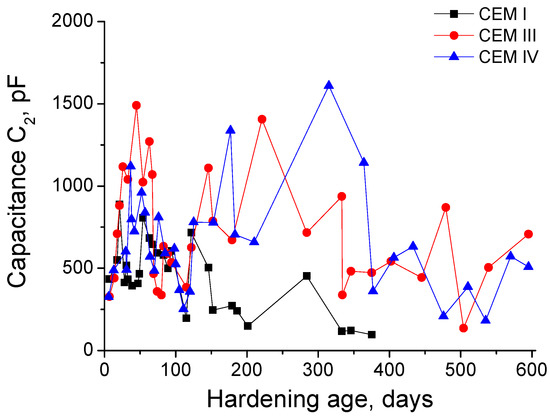 Results of capacitance C2 for CEM I, CEM III and CEM IV grouts.