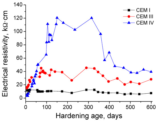 The results of electrical resistivity obtained for the three types of grouts studied are depicted in Figure 6. The lowest resistivity values at very early ages were observed for CEM IV grouts, although they showed a fast increasing rate with time. Until 50 days, the highest resistivity values corresponded to CEM III samples, and from that age, the CEM IV ones showed the greatest resistivity, which reached very high values compared to the rest of studied cement types. The resistivity for CEM IV grouts finished to rise at 200 days, keeping practically constant until 350 days and falling from then, although its values continued being considerably higher than for the rest of studied grouts at 600 days. The evolution of CEM III samples resistivity showed similar tendencies than previously described for CEM IV ones, but with lower values. Finally, the electrical resistivity for CEM I grouts showed small changes with time, and, in general, its values were the lowest of all studied cements.