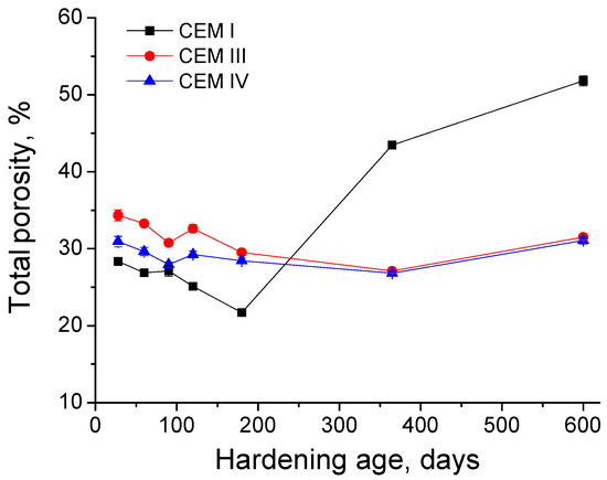 The changes with time of total porosity for the three types of grouts can be observed in Figure 7. From 28 to 180 days, this parameter decreased for all the samples studied. The lowest total porosities in that period were observed for CEM I grouts and the highest for CEM III ones, although the difference between porosity values for all the grout types was not too large. Between 180 and 600 days, total porosity showed very similar values and kept practically constant for grouts with slag and fly ash. On the other hand, in the abovementioned period, this parameter rose highly for CEM I grouts, showing a very great value at 600 days compared to the other kinds of grouts.