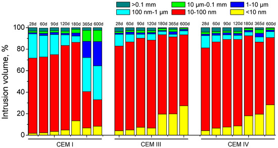 The progressive pore refinement in the short-term observed in all pore size distributions of the grouts (see Figure 8), and the fact that the volume of smaller pores was higher for CEM III and IV samples, also coincides with impedance spectroscopy and electrical resistivity results. However, as happened for total porosity, the effects of sulphate attack in the pore size distribution have only been noted for CEM I grouts, in which an important loss of microstructure refinement was observed at 365 and 600 days, while the pore network even became more refined for CEM III and IV samples.