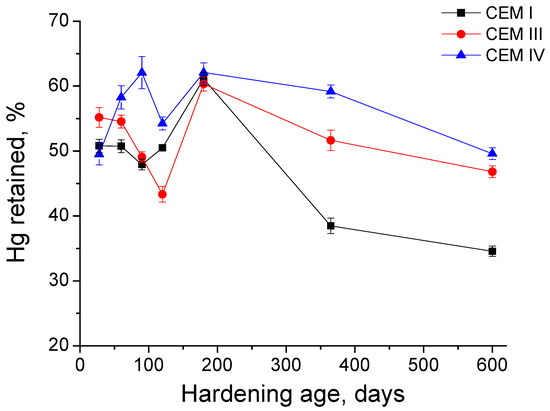 Regarding the percentage of Hg retained in the samples at the end of the experiment (see Figure 9), at 180 days the value of this parameter was very similar for all the studied grouts. However, until that age, the evolution of this parameter was different depending on the cement type used. First, the Hg retained kept practically constant for CEM I grouts between 28 and 120 days and increased from then to 180 days. For CEM III samples, this parameter decreased until 120 days, and rose at 180 days. Finally, the Hg retained of CEM IV grouts in general grew between 28 and 120 days, with the exception of a little fall observed at 120 days. In the long-term (exposure ages longer than 180 days), this parameter decreased for all the samples, being this reduction more noticeable for CEM I grouts, which showed the lowest Hg retained value at 600 days. This drop was slower for grouts with slag and fly ash, especially for CEM IV ones, although at 600 days the Hg retained was very similar for both CEM III and IV grouts.