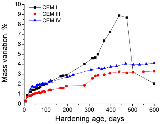 With respect to the mass variation experienced by the grouts due to the contact with the sulphate medium, the changes with time of this parameter can be observed in Figure 10. During the first 300 days, this parameter showed a progressive increase for all the grouts. Nevertheless, from that age, it started to rise quickly for CEM I samples, whereas it tended to stabilize for CEM III and IV ones. The maximum value of mass variation percentage for CEM I specimens was reached at 400 days approximately, when it started to decrease very fast. This great fall in the long-term was not observed for grouts with slag and fly ash.