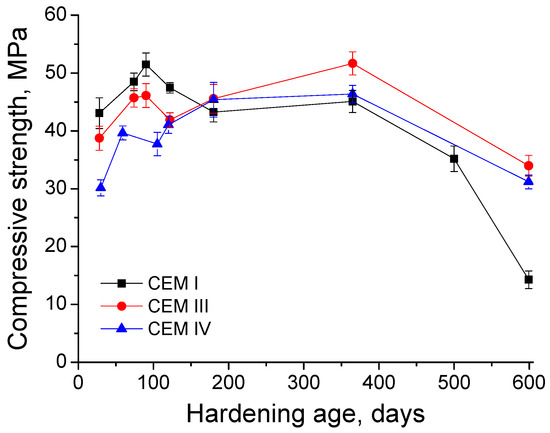 Lastly, the compressive strength results (see Figure 11) until 90 days are controlled by the strength type of each cement, then the greatest values of this parameter corresponded to CEM I grouts, which is the only high early strength cement used, followed by CEM III grouts (the slag cement was a low early strength type) and CEM IV ones (the fly ash cement was the lowest strength type). In spite of that, from 180 days the compressive strength was higher for slag and fly ash cement grouts than for CEM I ones. It is important to note that the growth of this parameter for CEM IV grouts was slower at early ages, which is in agreement with microstructure characterisation results, and would show the delay of fly ash pozzolanic reactions development. In relation to the sulphate attack effects in the compressive strength, it started to decrease at 90 days for CEM I grouts, although its main fall was produced from 365 to 600 days, when the compressive strength was only approximately a 27% of the maximum value of this parameter, reached for this CEM I grouts at 90 days, so there has been a severe loss of strength for these samples. In contrast, the decrease of compressive strength for CEM III and IV grouts was produced only between 365 and 600 days, and the value of this parameter at that age for both cement types was about the 67% of their highest strengths, observed at 365 days. Then, the grouts prepared with CEM III and IV, hardened in contact with a sulphate medium, showed better compressive strength performance in the very long-term compared to CEM I grouts.