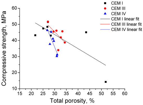 Relationship between compressive strength and total porosity for CEM I, III and IV grouts.